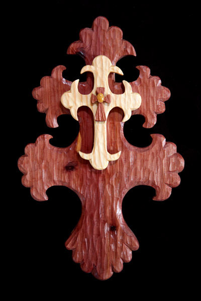 This is my design of a Lorraine Cross. Hermetic alchemists of the Renaissance used the emblem as a symbol of earth and spirit. This cross is created with cedar and pine.