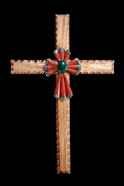The backing cross is made with birch wood. The top cross is a cedar "Mi Sueno" cross. The ends of the "Mi Sueno" cross are painted with acrylic. The center stone is Malachite. Malachite is worn by many to detect impending danger. This stone offers bands of varying hues and is believed by many to give extra energy. It is believed that gazing at Malachite or holding it relaxes the nervous system and calms stormy emotions. Malachite is said to bring harmony into one’s life. It is also believed that malachite gives knowledge and patience. Malachite is used as a children’s talisman to ward off danger and illness. It is attached to an infant’s cradle.Size: 14.25" x 9.25"Price: $95 |