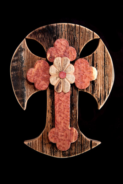 Barn wood Rounded Cross with a cedar "Eric Cross" and a barn wood rosette and stone.